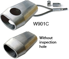 The inspection hole guarantees control of the correct inserted length of wire rope before and after swaging. These types of ferrules have to be swaged with the conical type C swaging dies.
